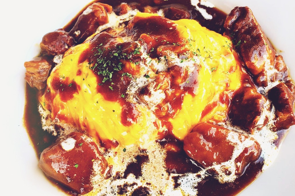 とろとろ半熟オムレツを乗せたオムライスは当店の看板メニュー。